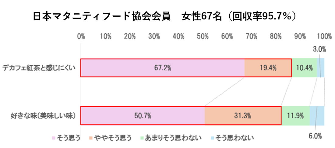 普段カフェイン摂取に気を遣っている日本マタニティフード協会の会員女性67名に試飲調査を行ったところ、デカフェ紅茶と感じにくいと答えた人が86.6%、好きな味(美味しい味)と答えた人が82%という結果に。デカフェでも本格的な紅茶として、更に美味しさを実現いたしました。